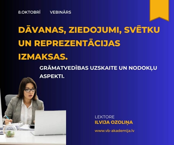 Semināra lektore: Mg. Oec. ILVIJA OZOLIŅA, Nodokļu konsultante, sertificēta praktizējoša grāmatvede ar divdesmit gadu pieredzi, grāmatvedības kursu pasniedzēja, nodokļu semināru lektore. Ieguvusi sociālo zinātņu maģistra grādu ekonomikā. Strādājusi Valsts ieņēmumu dienestā (VID), kur nodokļu maksātājiem veikusi auditus, tematiskās pārbaudes, sniegusi konsultācijas. Jau astoņus gadus vada grāmatvedības ārpakalpojumu uzņēmumu ar klientu loku no dažādām nozarēm. Grāmatvedības kursu pasniedzēja Lasīt vairāk ... |
